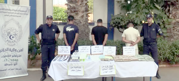 Des opérations de police ont été programmées dans les foyers de criminalité avec exécution de mandats de perquisition aux domiciles des suspects pour procéder à leur arrestation». L’opération a permis la saisie de «3910 comprimés psychotropes, 199 comprimés de drogue dure +ecstasy+, 700 g de kif traité, 5 g de drogue dure +cocaïne+, 61 flacons de solution anesthésiante, une balance électronique, 6 armes blanches prohibées de différents types et calibres ainsi qu’une somme d’argent en monnaie nationale estimée à 835 millions de centimes». «Les suspects ont été présentés devant le procureur de la République près le tribunal de Dar El-Beïda», conclut le communiqué.