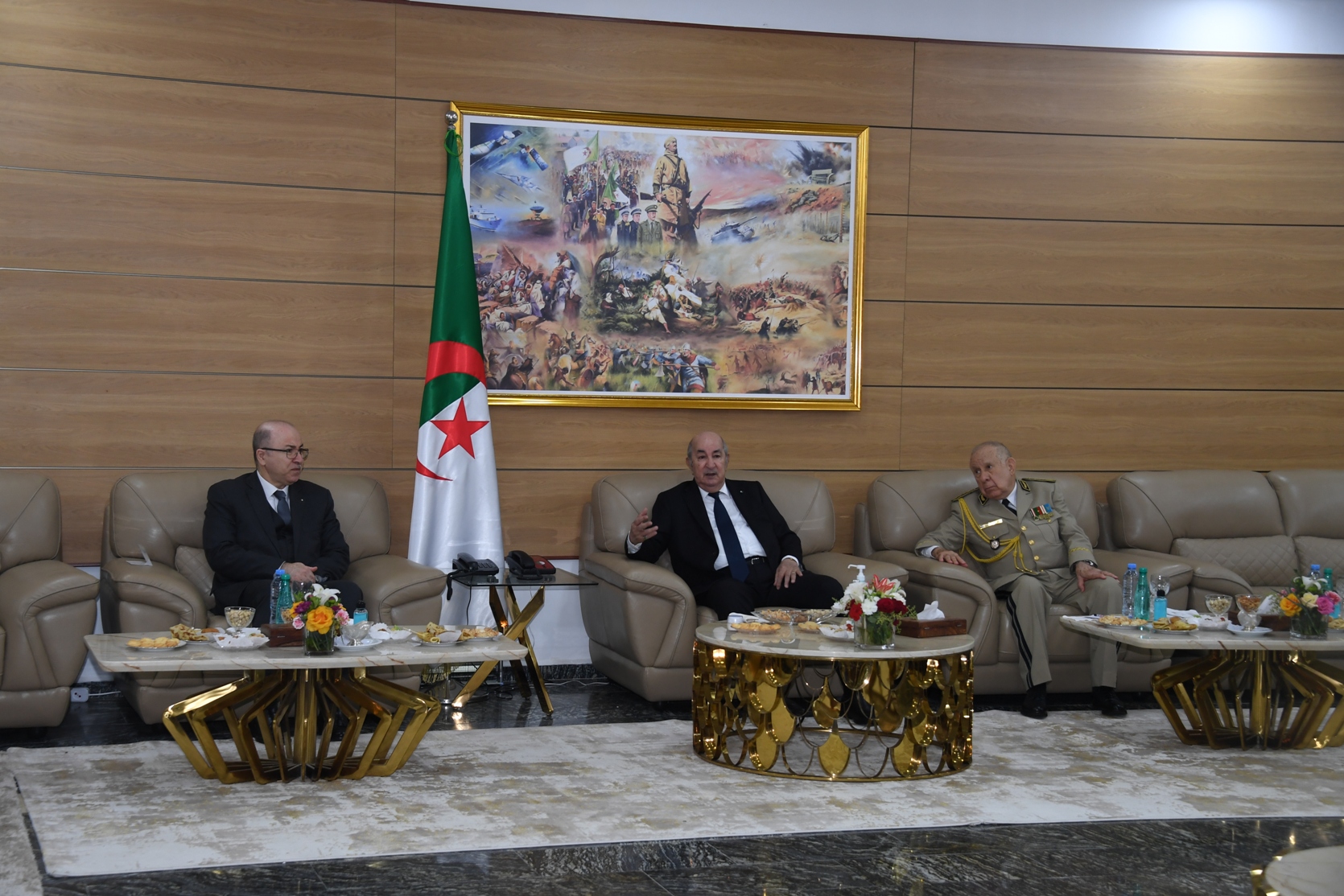 Le président de la République a été accueilli à l’entame de la cérémonie, abritée par le Cercle national de l’Armée à Beni Messous, par le Chef d’Etat-Major de l’Armée nationale populaire (ANP), le Général d’Armée Saïd Chanegriha, où une formation militaire lui a rendu les honneurs.