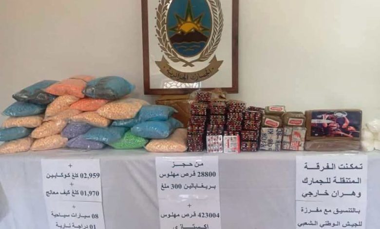 Dans le cadre des missions de terrain en cours, la brigade mobile relevant de l’Inspection divisionnaire des Douanes d’Oran Extérieur, en coordination avec un détachement de l’Armée nationale populaire, a mené une opération ayant permis la saisie de 2,959 kilos de cocaïne, 1,970 kilos de kif traité, 423.004 comprimés de psychotropes de type «ecstasy» et 28.800 comprimés de psychotropes de type «Prégabaline 300 mg».