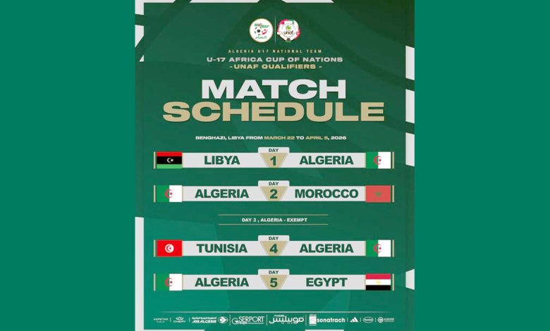 Cinq pays dont l’Algérie prendront part au tournoi de l’Union nord africaine de football (UNAF), qualificatif à la phase finale de la Coupe d’Afrique des Nations CAN 2026 de la catégorie des moins de 17 ans (U17), prévu à Benghazi (Libye) du 22 mars au 5 avril, a indiqué l’instance maghrébine à l’occasion du tirage au sort effectué ce jeudi.